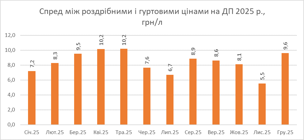 Роздрібні ціни поки не реагують на зміни у гурті, через що певної миті спред між гуртом і роздробом збільшився до найбільших з середини квітня 11,28 грн/л. Загалом за 17 днів грудня середня різниця між цими сегментами становила 9,6 грн/л, що на 4,1 грн/л перевищує показник жовтня і на 1,34 грн/л більше за середній спред з початку року.