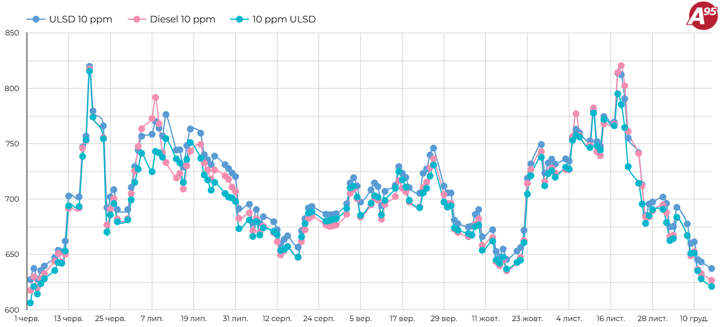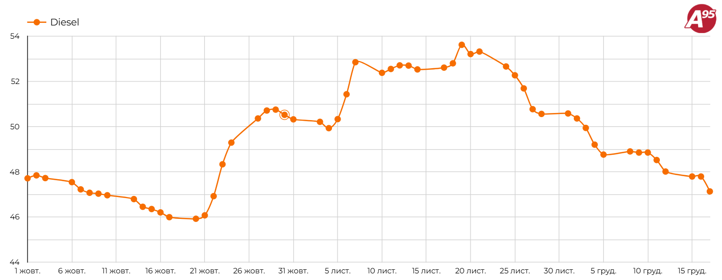 На зниження зовнішнього ринку реагують і ціни на дизель на внутрішньому ринку. Згідно з моніторингом Консалтингової групи «А-95», середня вартість пального з початку грудня знизилася на 3,45 грн/л (47,13 грн/л), а з початку падіння у листопаді — на 5,48 грн/л.