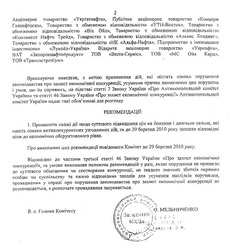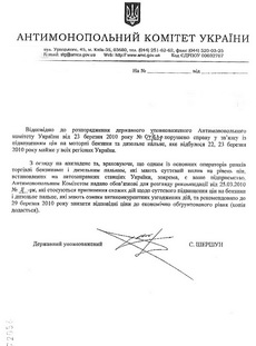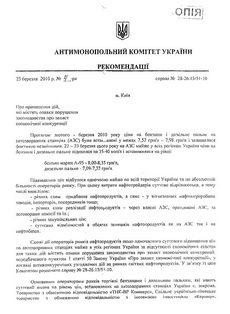 Антимонопольный комитет Украины (АМКУ) рекомендует нефтетрейдерам снизить розничные цены на бензин и дизельное топливо до 29 марта 2010 г. до экономически обоснованного уровня. Как сообщил 25 марта и.о. главы АМКУ Александр Мельниченко, комитет также возбудил дело против 15 трейдеров по признакам согласованных действий при повышении цены на бензины и дизельное топливо на розничном рынке нефтепродуктов.