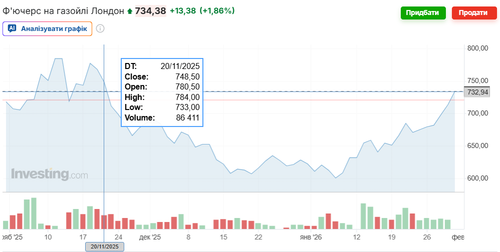 І це при тому, що за тиждень європейські котирування у середньому зросли на майже $40/т, або трохи більш як 1,7 грн/л. Додатково погіршувало ситуацію і подальше зростання ф’ючерсів на газойль на Лондонській біржі. Станом на 17:25 30 січня ICE Gasoil досягнув максимуму з третьої декади листопада — $734/т (+$13/т за день і +$52/т з початку тижня)