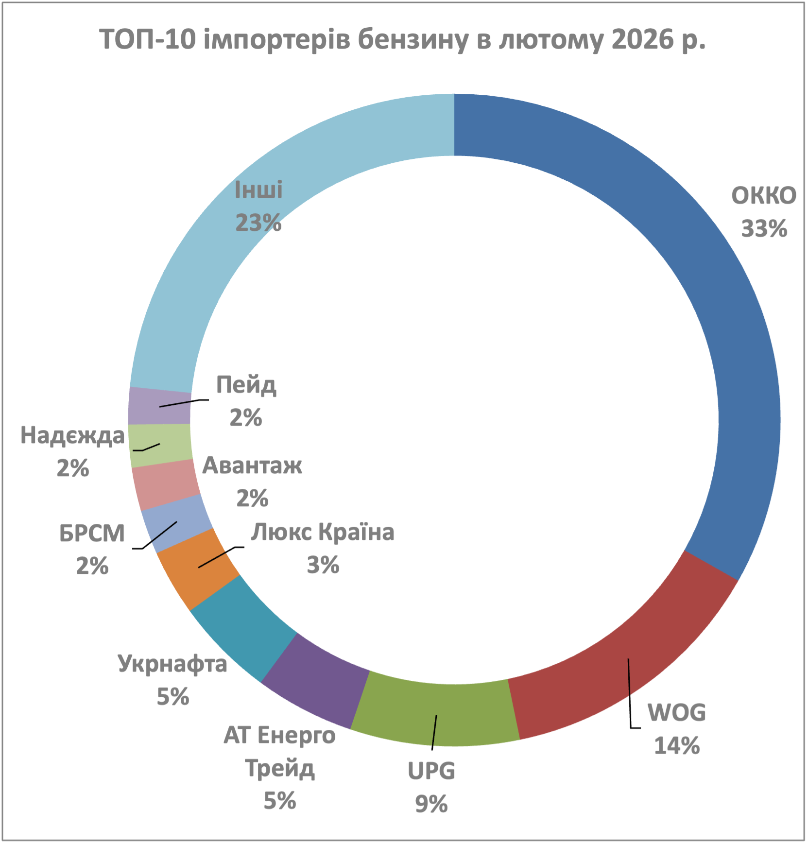 Вимкнення світла в українських регіонах цієї зими сприяло зростанню кількості імпортерів. У січні число компаній збільшилося з 88 до 97, а в лютому підскочило до 105. Такого різнобарв’я серед імпортерів не було з серпня 2024 року, коли ринок готувався до першого етапу підвищення акцизів на бензин. Утім, на розподіл обсягів між «топами» і рештою це ніяк не вплинуло — на перший десяток у лютому так само, як і у січні, припало 77% імпорту.