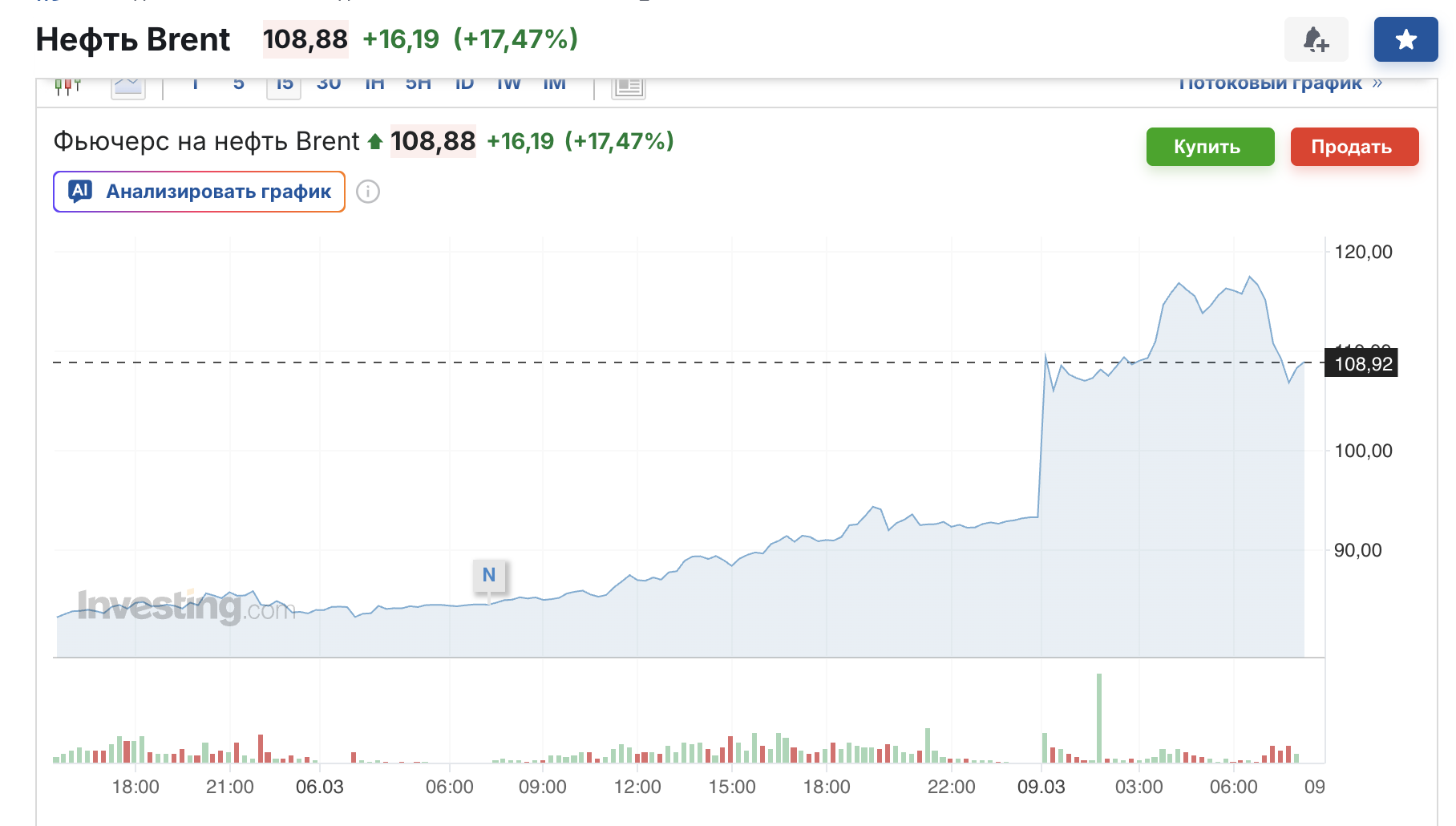 Ф’ючерси на нафту Brent станом на 8:15 за Києвом зросли на $15,72, або 17%, — до $108,41 за барель. Водночас ф’ючерси на американську нафту West Texas Intermediate (WTI) піднялися на $14,98, або 16,19%%, — до $104,98 за барель.