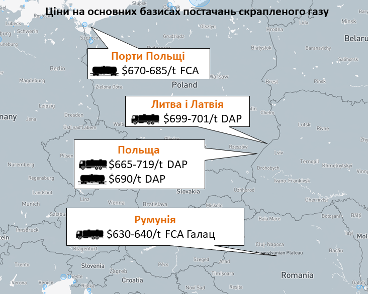 Попит на залізничні обсяги з польського напрямку був слабким через високі ціни пропозиції. Серед опитаних компаній лише одна пропонувала вагони суміші за $690/т DAP Ізов. На закарпатському напрямку також не було активності. Компанія Eurogas LPG повідомила, що продала весь обсяг бутану й чекає на наступне постачання.