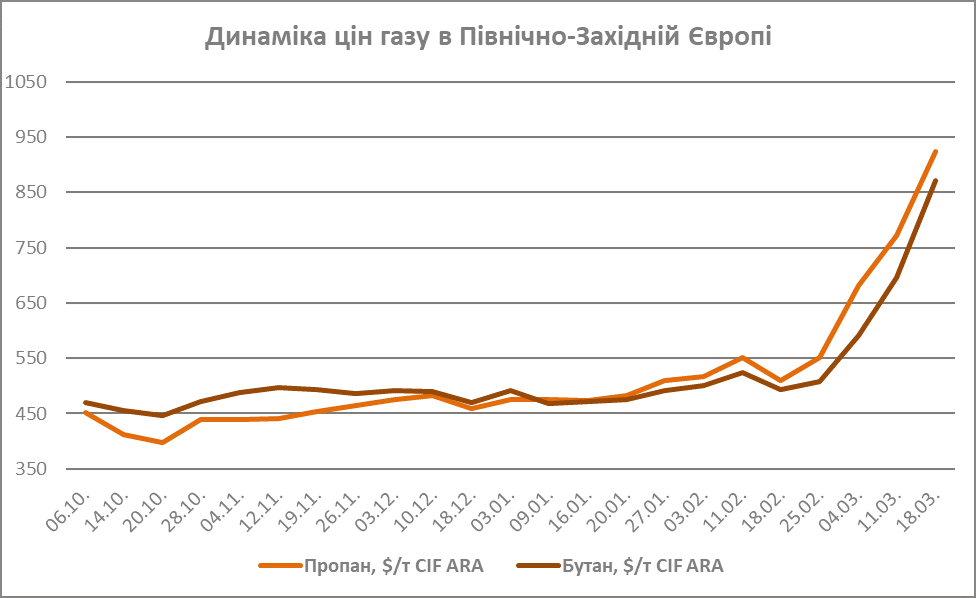 На перебої постачань з американського термінала, який щомісячно експортує близько 1 млн т газу, європейський ринок відреагував зростанням цін. Упродовж 18-19 березня котирування великих партій пропану зросли на $132/т, до $971/т CIF ARA. Бутан здорожчав на $121/т, до $922/т. За тиждень зростання цін на пропан становило $199/т, на бутан — $226/т.