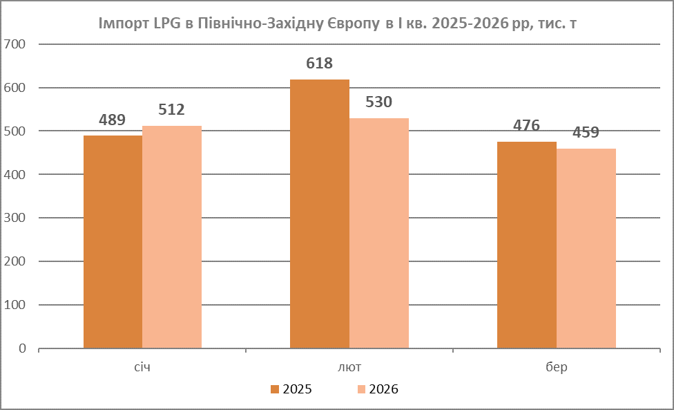 У лютому північно-західна Європа імпортувала 530 тис. тонн скрапленого нафтового газу, що більше, ніж 512 тис. тонн у січні, але менше, ніж 618 тис. тонн, постачених роком раніше.