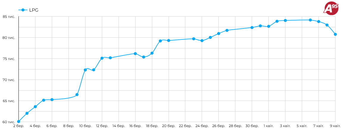 Згідно з моніторингом Консалтингової групи «А-95», за тиждень, з 2 по 9 квітня, середня вартість скрапленого газу на умовах FCA знизилася на 3 100 грн/т — до 80 760 грн/т. Водночас у розрізі окремих компаній і регіонів цінова динаміка була більш волатильною: лише за 8–9 квітня вартість точково просіла до 5 000 грн/т.
