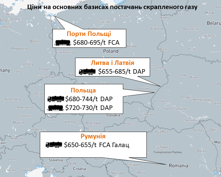 Ціни на автомобільні партії суміші на литовських терміналах упродовж тижня зменшилися на $20-40/т після того, як Мажейкяйський НПЗ збільшив обсяги пропозиції. З урахуванням вартості транспорту до польсько-українського кордону це становило $655-685/т.
