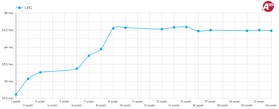Згідно з моніторингом Консалтингової групи «А-95», середня вартість ресурсу знизилася на 110 грн/т, до 54 480 грн/т. На майже таку ж величину (120 грн/т) здешевшав газ на торгах ГЕО Альянс: 56 280 грн/т. Водночас, на аукціоні внутрішніх виробників 22 жовтня на Українській енергетичній біржі цінники на пальне змінювалися різноспрямовано залежно від регіону: якщо північний схід і центр знизився, то захід — додав.