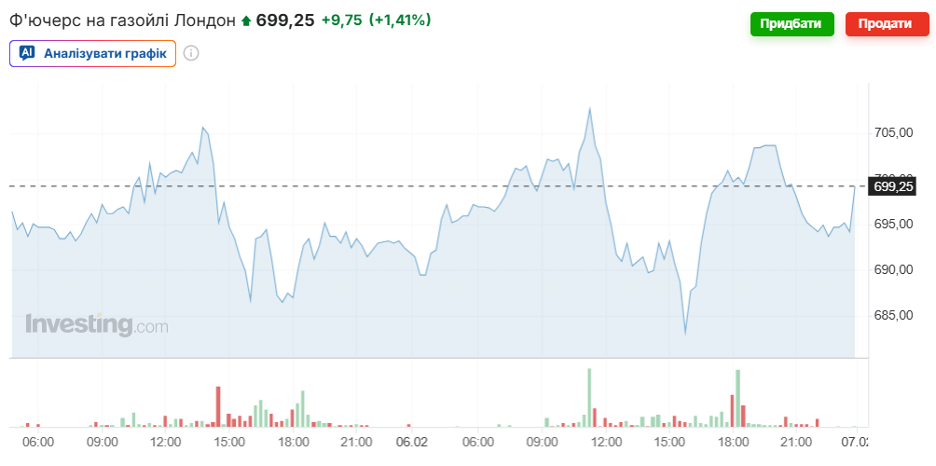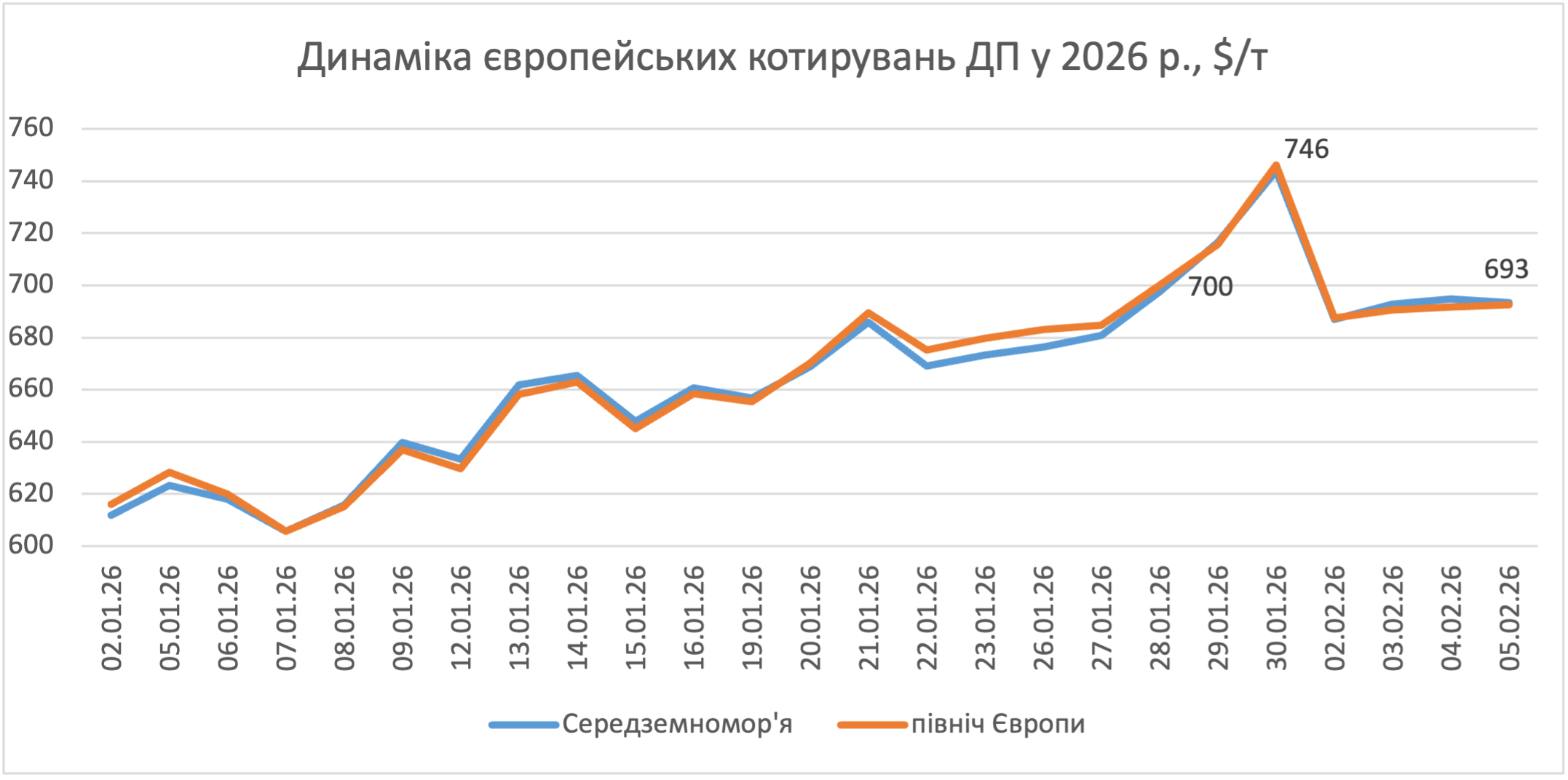 Минулого тижня європейські котирування зробили круте піке та майже повернулися до рівнів тижневої давності. Станом на 5 лютого, вартість пального в Європі в середньому варіювалася в межах $682-705/т (-$52/т).