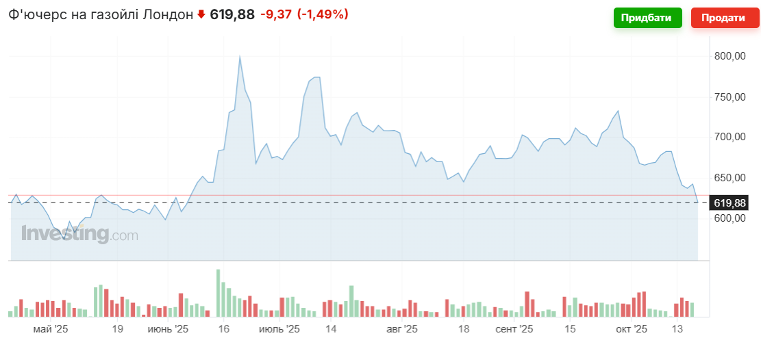З початку жовтня ф’ючерси на газойль на Лондонській біржі зменшилися майже на $68/т і на 12:55 17 жовтня становили $620/т, що є найменшим значенням з першої декади червня. Про це свідчать дані Investing.com.