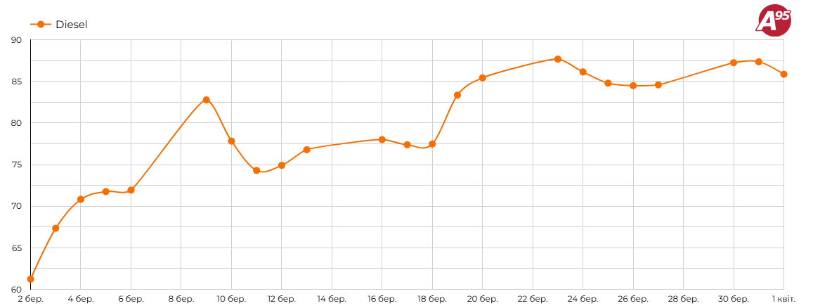 Згідно з моніторингом Консалтингової групи «А-95», станом на 1 квітня, середня гуртова ціна на дизель становила 85,85 грн/л, що на 1,50 грн/л нижче від вартості на кінець березня.