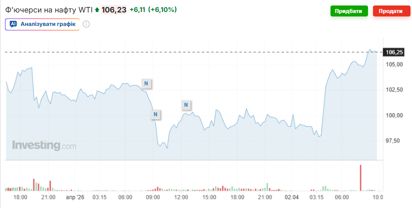 Водночас нафта Brent зросла майже до $108/бар. (+$6,8, або майже 6,72%), американська нафта West Texas Intermediate — до $106,4/бар. (+$6,32, або 6,31%).