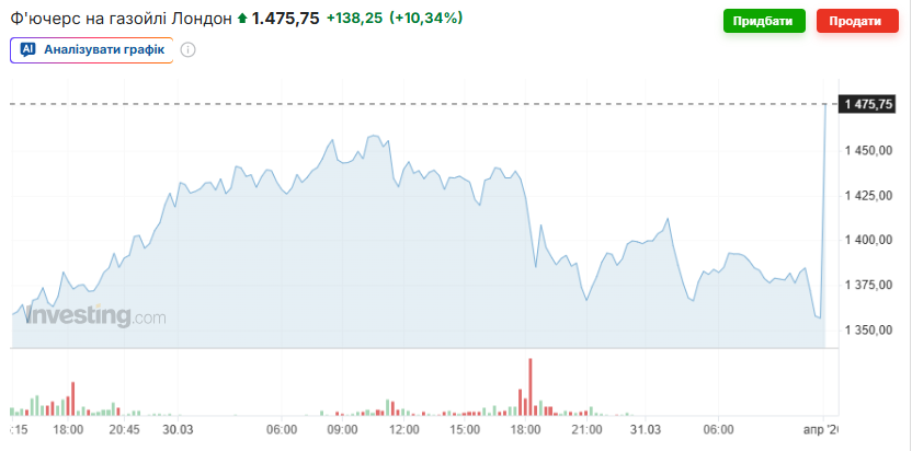 2 квітня ф’ючерси на газойль на Лондонській біржі знову злетіли. Згідно з даними Investing.com, станом на 9:50 ICE Gasoil торгувався в межах $1 476/т, що на $138/т вище від рівня відкриття торгів і на $111/т — за показник попередньої сесії.