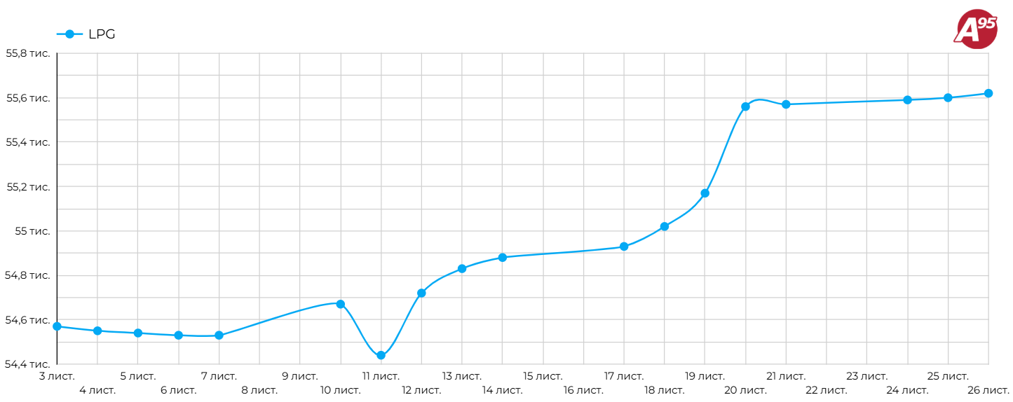 Згідно з моніторингом Консалтингової групи «А-95», середня вартість пального за 26 днів листопада зросла на 1 050 грн/т, або 0,57 грн/л (при густині 540 кг/м3), до 55 620 грн/т (30,03 грн/л). Тижневий приріст, з 19 по 26 листопада, становив 450 грн/т (0,24 грн/л).
