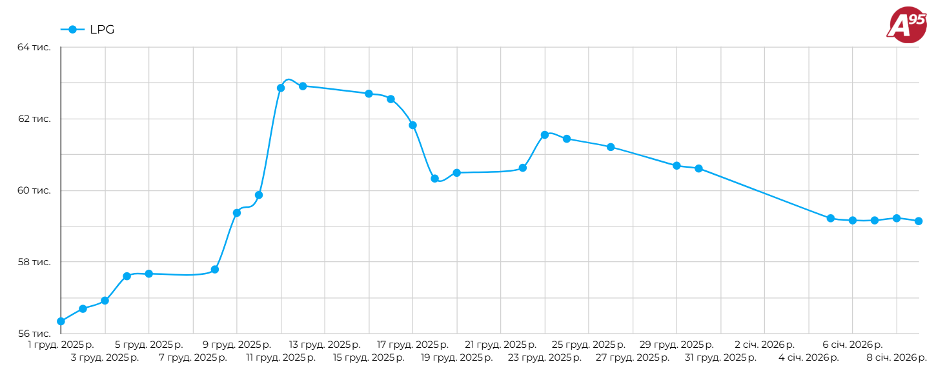 Згідно з моніторингом Консалтингової групи «А-95», середня вартість скрапленого газу становить 59 140 грн/т, що на 1 470 грн/т нижче від показника кінця грудня, і відповідає рівню початку минулого місяця з урахуванням оновлених акцизів.