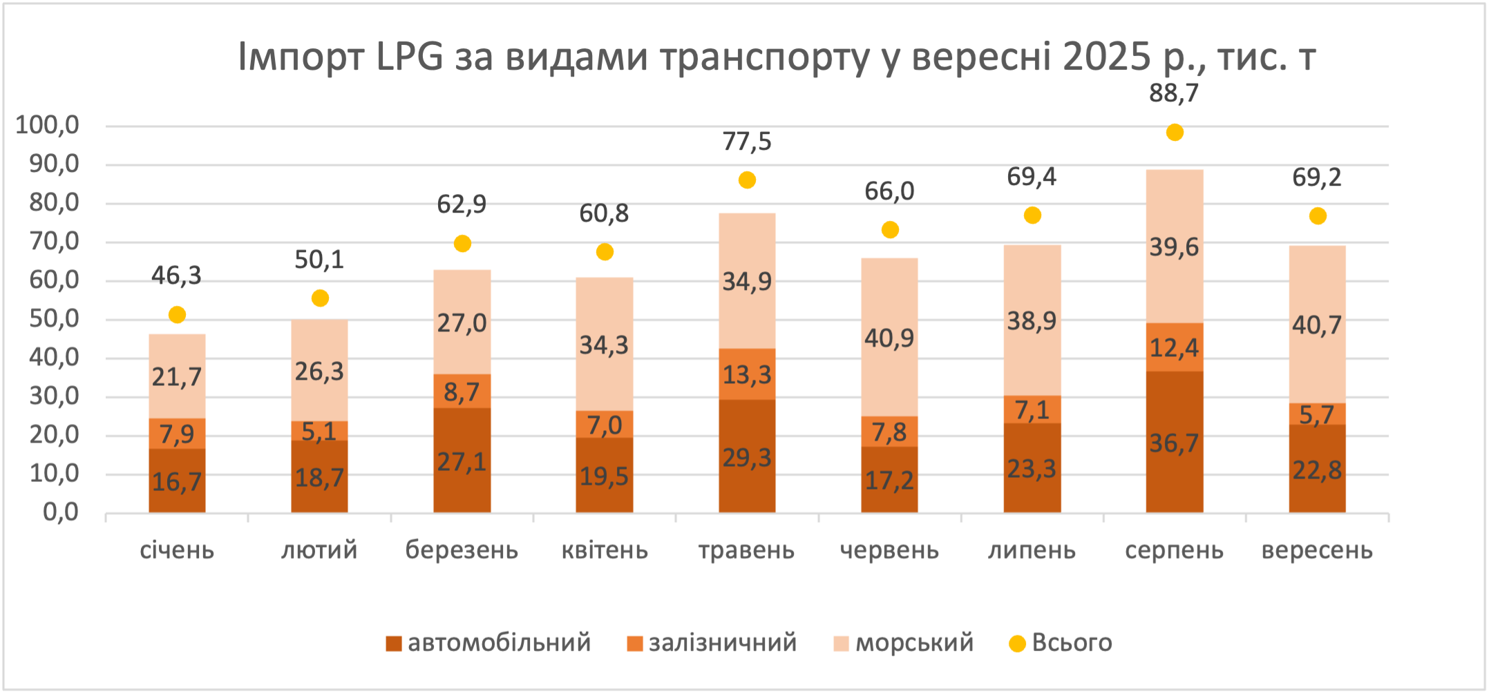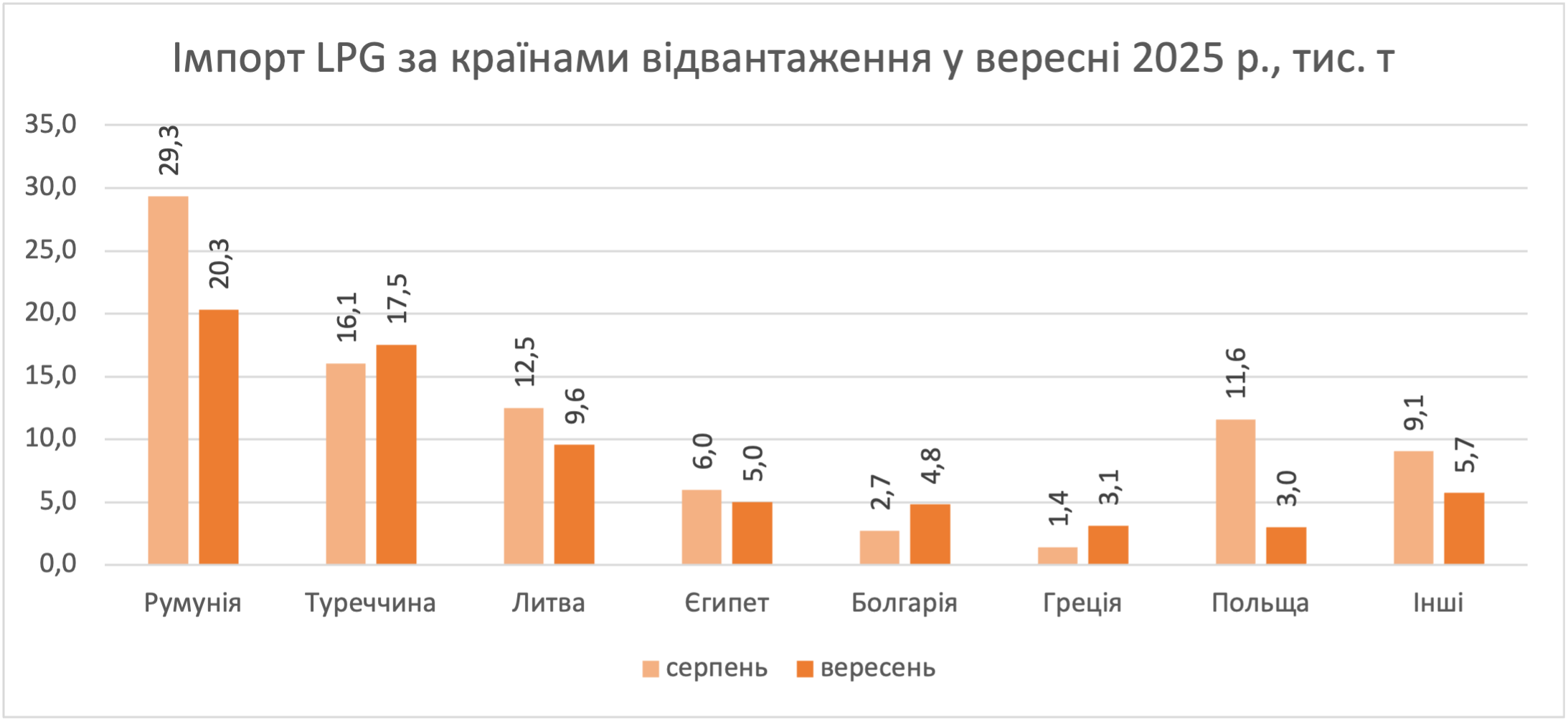 Традиційно найбільші обсяги надходили з Туреччини — 17,5 тис. т проти 15,9 тис. т у серпні. Основна частина — від Likitgaz Dagitim (12,8 тис. т, +85% до серпня), решта — від Aygaz.