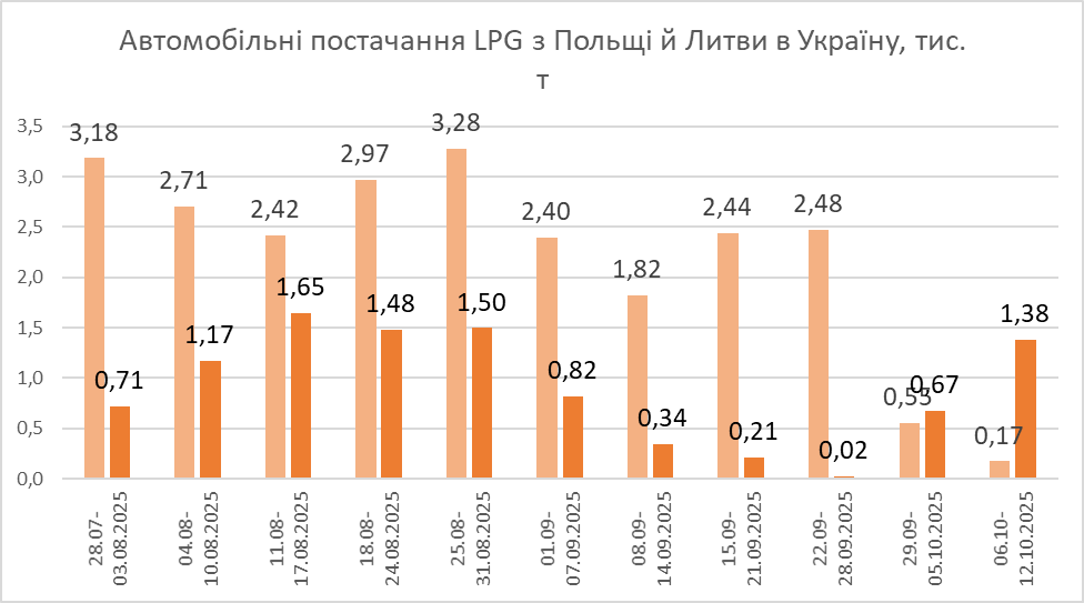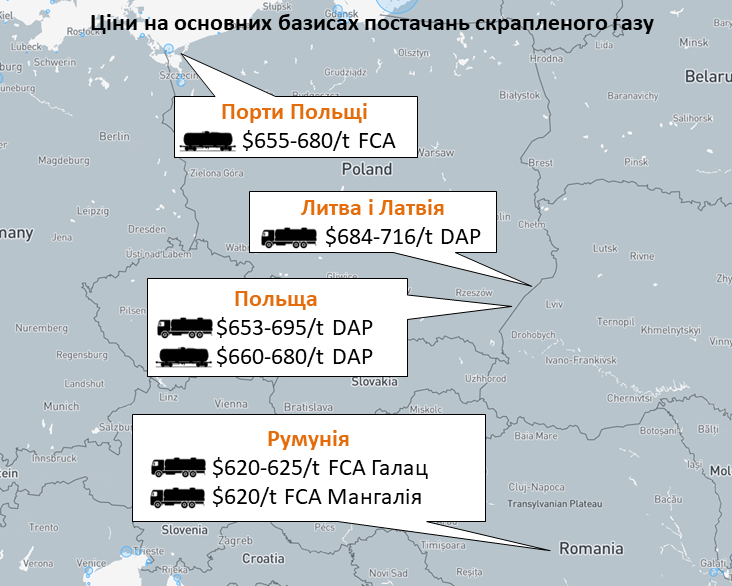 Зростання цін у Польщі на початку жовтня змінилося зниженням під впливом західних котирувань і збільшення надходжень російського бутану зі сходу. Цього тижня автомобільні партії суміші на східних і південних терміналах здешевшали на $18-20/т, до $617-645/т, на умовах FCA. З урахуванням вартості доставлення до польсько-українського кордону газ здешевшав на $10-21/т, до $653-695/т.