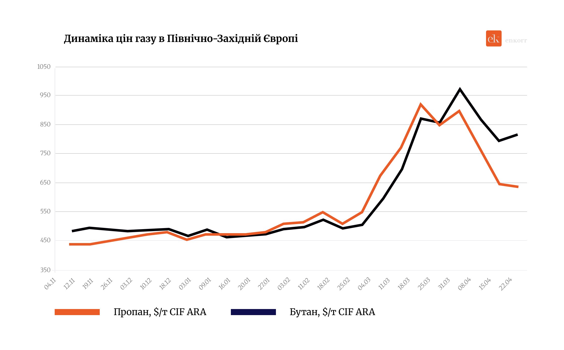 Падіння котирувань скрапленого газу в Європі фактично зупинилося після новин про зрив переговорів Ірану й США. Упродовж тижня вартість великих партій пропану зменшилася лише на $11/т, до $639/т CIF ARA. Бутан на торгах 22 квітня здорожчав на $36/т до котирувань попереднього дня і торгувався на рівні $818/т CIF ARA. Тижневе зростання становило $21/т.