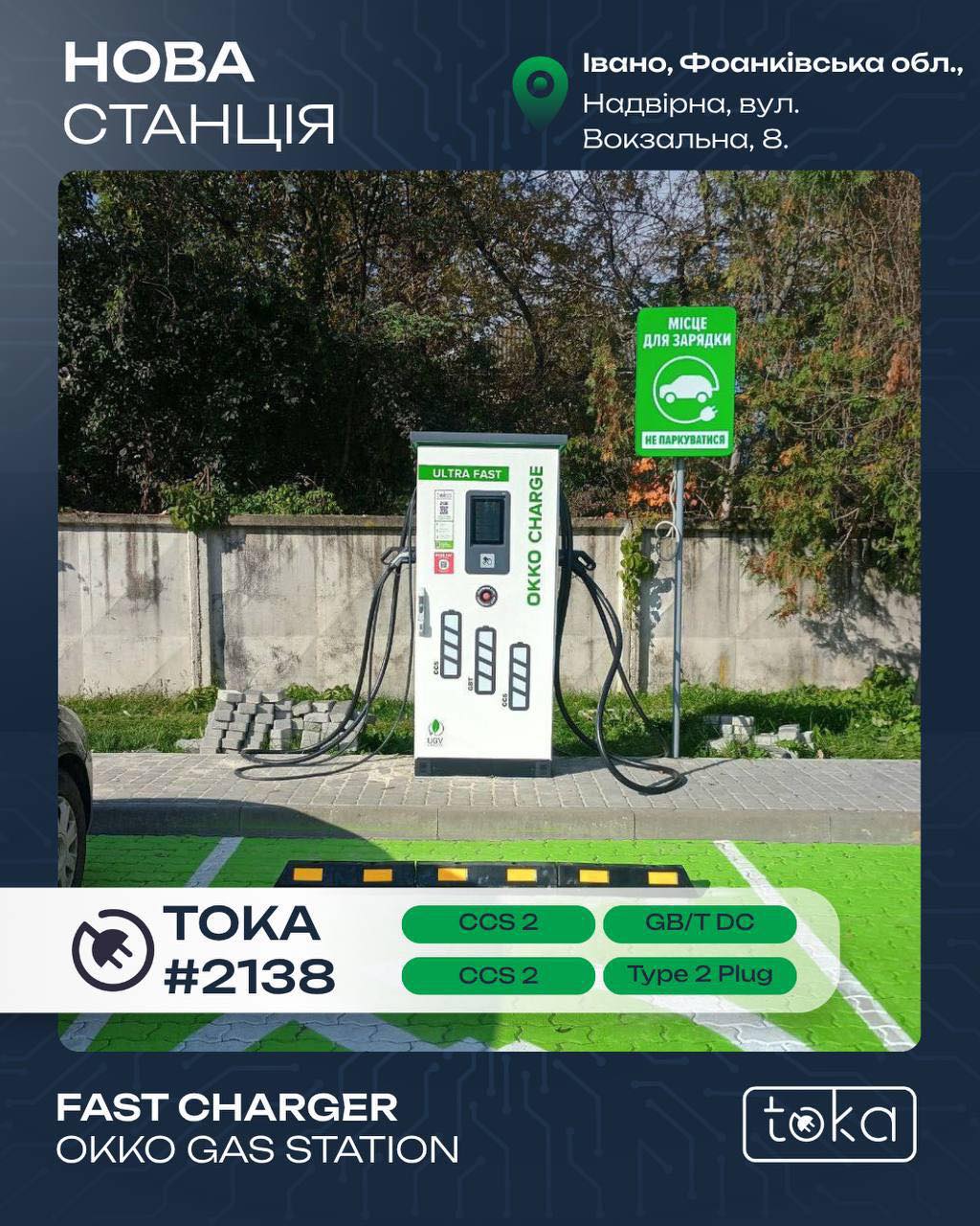 Станція TOKA №2138 розташована на АЗС ОККО за адресою: м. Надвірна, вул. Вокзальна, 8.