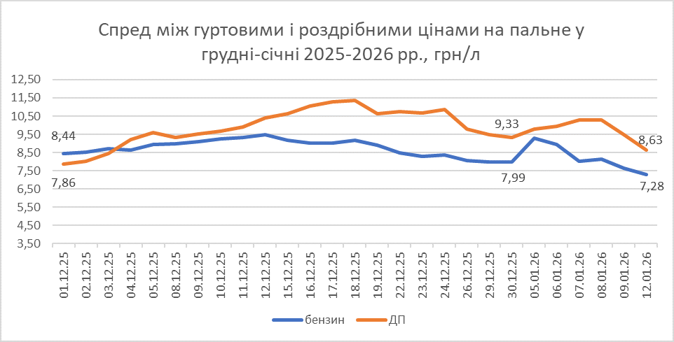 Через зміни у гурті спред між ним і роздробом станом на 12 січня на бензині знизився на 2 грн/л (7,28 грн/л), на дизелі — на 1,15 грн/л (8,63 грн/л). Різниця на бензині опустилася нижче від середнього рівня минулого року на 1,68 грн/л, на дизелі — залишається приріст у 0,23 грн/л.