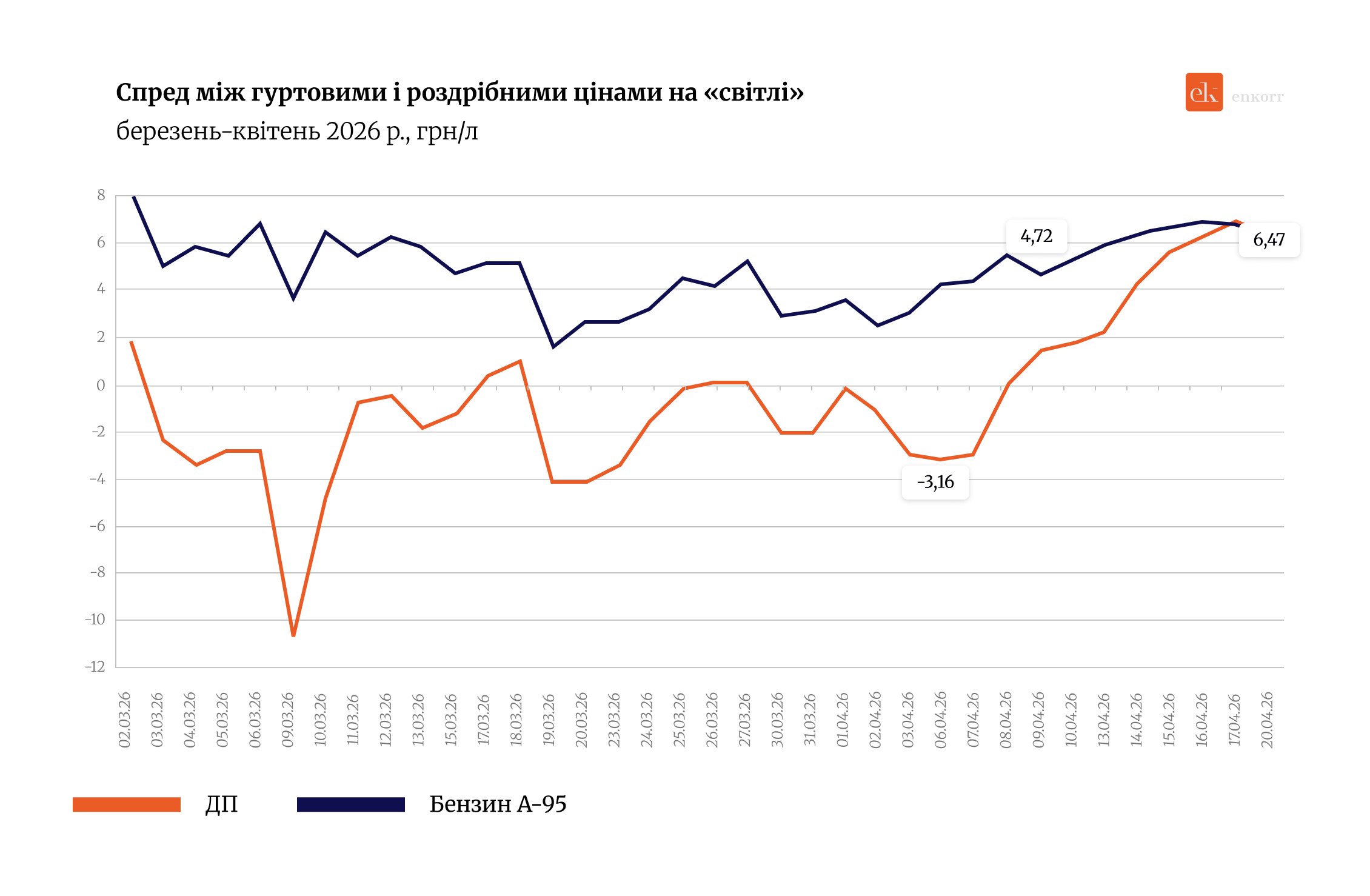 Більш активному зниженню завадили запаси, нові надходження дорогого ресурсу, а також низька маржинальність. Така динаміка дозволила мережам повернути позитивний спред між гуртом і роздробом після березня, протягом якого гурт був стабільно вищим за роздріб. Станом на 20 квітня різниця між сегментами на «світлих» трохи перевищила 6,40 грн/л для кожного. За тиждень спред на дизелі зріс на 4,18 грн/л, на бензині — на 51 коп./л.