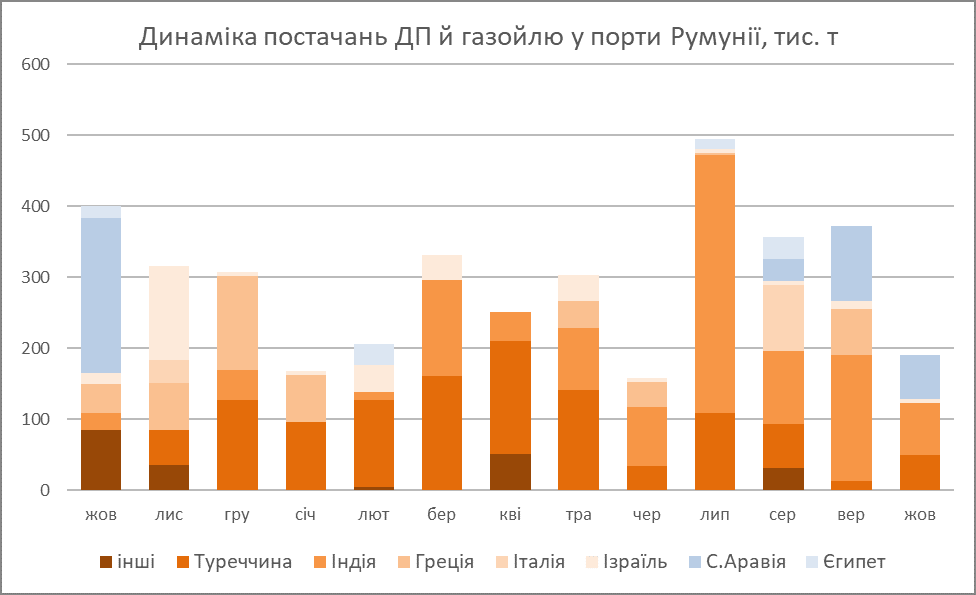 За 10 місяців обсяги перевалки дизпального в румунських портах впали на 21%, до 2,83 млн т. Найбільшими постачальниками були Індія (1,07 млн т), Туреччина (945 тис. т) і Греція (207 тис. т).