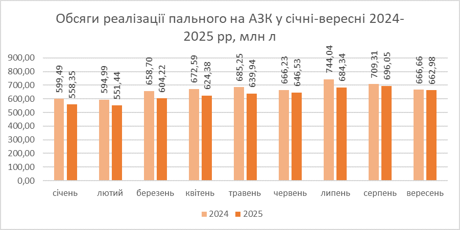 За 9 місяців 2025 року обсяги реалізації всіх видів пального порівняно з аналогічним періодом минулого року знизилися на 5%, до 5,7 млрд л. Водночас вартість реалізованого пального через РРО зросла на 2%.