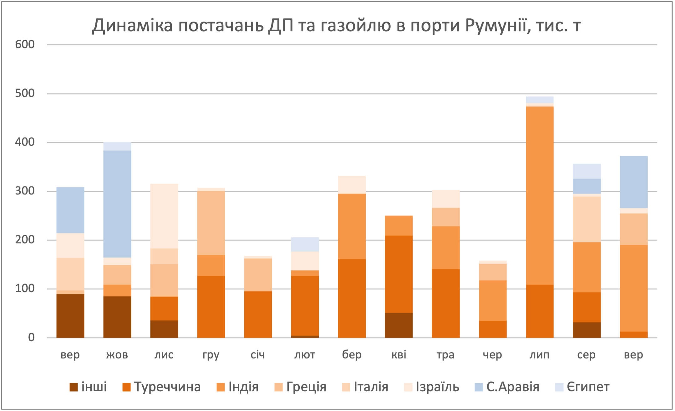 Найбільшою країною-постачальником залишилася Індія: минулого місяця до Констанци надійшло два судна з паливом виробництва Reliance Industries загальним обсягом 178 тис. т. У середині вересня стало відомо, що термінал у Констанці може потрапити під українські санкції за постачання індійського дизпального, виробленого з російської нафти. Однак ті індійські партії, що прямували до румунського порту, були законтрактовані до оголошення заборони.