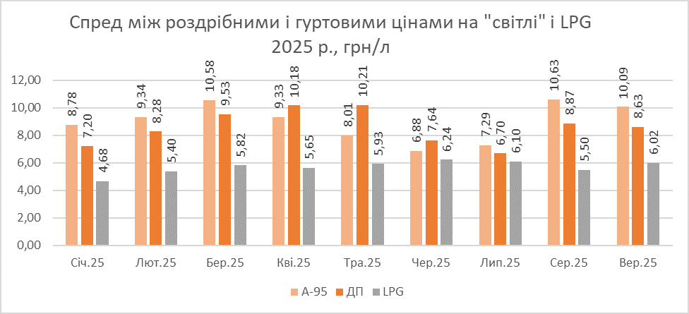 Згідно з розрахунками enkorr, у вересні спред між гуртовою і роздрібною ціною на бензин знизився порівняно з серпнем на 55 коп./л, до майже 10,1 грн/л, на дизелі — на 24 коп./л, до 8,63 грн/л. Водночас на скрапленому газі зріс на 50 коп./л, до трохи вище 6 грн/л.