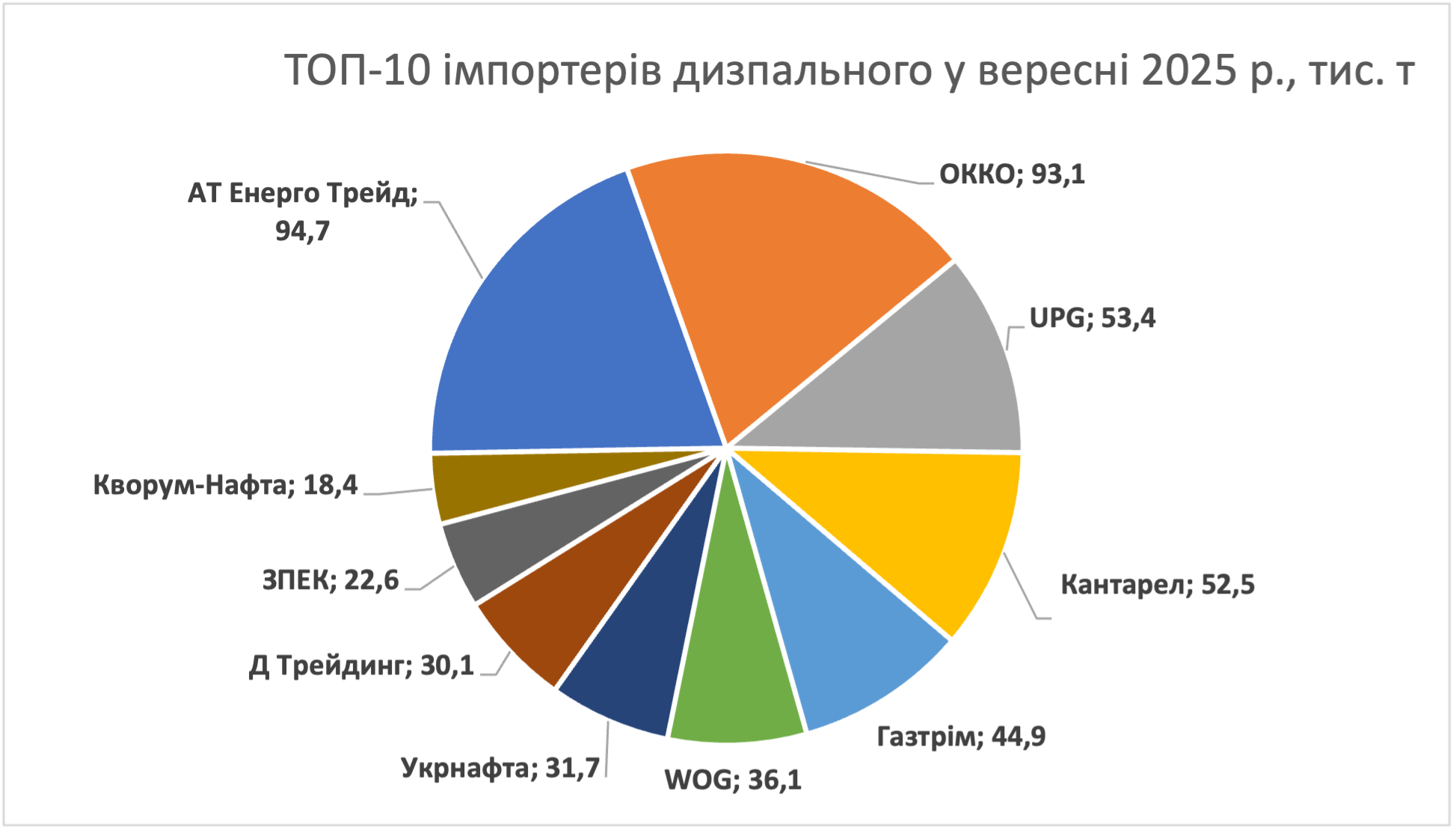 ТОП-10 імпортерів дизелю залізницею у вересні 2025 р., тис. т