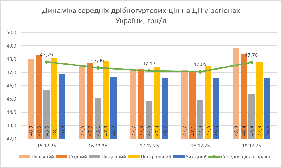 Станом на 19 грудня найбільший приріст цін фіксувався у північних і східних областях. На півночі середня вартість пального зросла на 1,65 грн/л, до 48,85 грн/л, на сході — на 1,28 грн/л, до 48,37 грн/л. У розрізі областей найсуттєвіше додала вартість у Київській області: +2,27 грн/л (49,44 грн/л). Найвищі ціни пропонували «Дюваль компані» і ЗНГК: 53,30 грн/л. Найнижча — 46,80 грн/л — фіксувалася в УНТК.