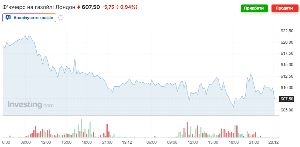 З 12 по 18 грудня європейські котирування дизельного пального зменшилися в середньому на $15/т ($613-633/т), або 0,63 грн/л, і в моменті досягали мінімального з початку червня рівня: $607-625/т.