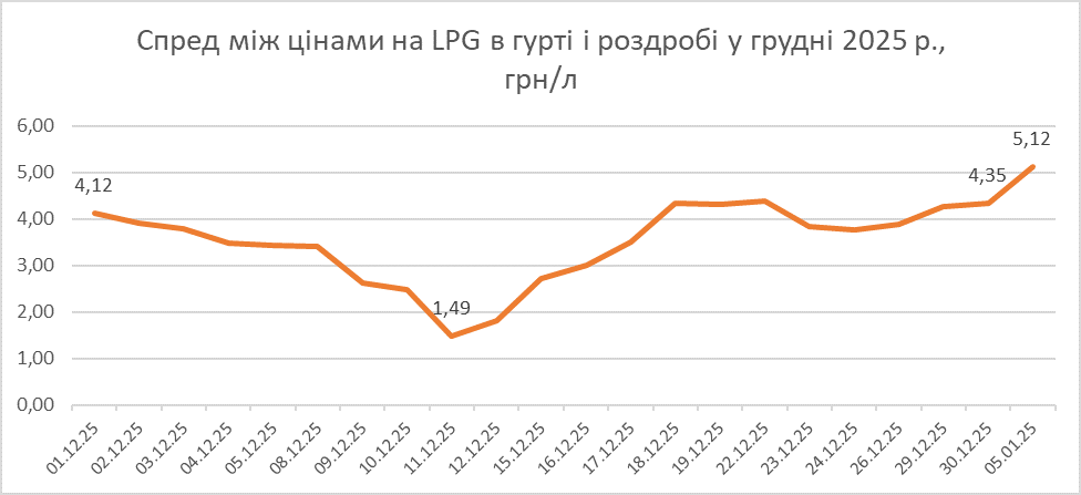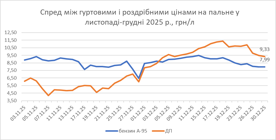 Так, станом на 5 січня різниця між гуртовими й роздрібними цінами зросла до 5,12 грн/л після падіння у грудні до найменшого місячного показника за рік — 3,48 грн/л.