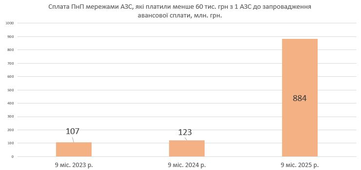 Що отримав бюджет? Сплата ПнП за 9 міс. 2025 р. мережами, які 2024 року сплачували менше від тих 60 тис. грн/міс. (тобто всіма, крім зазначеної вище трійки), зросла у понад 7 разів – зі 123 до 884 млн грн (див. діаграму).