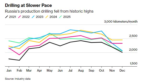 Експерти зазначають, що для підтримання щоденного видобутку на рівні 9,2-9,4 млн б/д росії потрібно бурити від 26 тис. до 29 тис. км свердловин щороку. Будь-яке падіння нижче від цього рівня неминуче призведе до скорочення видобутку.