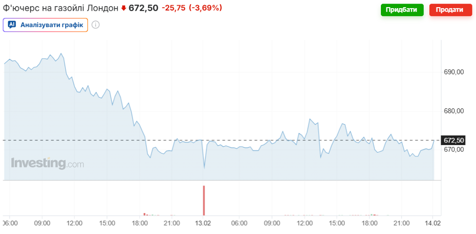 Згідно з даними Іnvesting, динаміка зберігається. Так, 13 лютого ф’ючерси на газойль на Лондонській біржі зменшилися на майже $26/т, до майже трьохтижневого мінімуму $673/т.