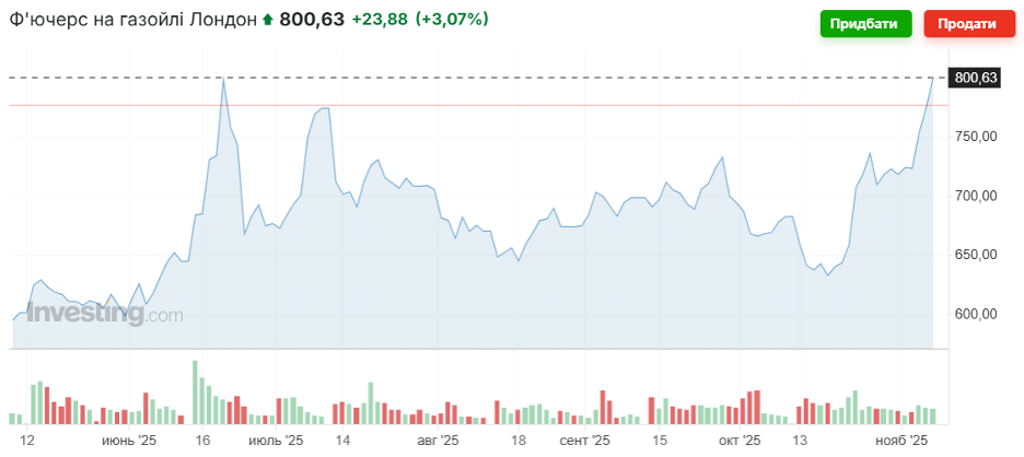 Ці всі обмеження були накладені на здороження зовнішнього ринку. Згідно з Investing.com, 7 листопада ф’ючерси на газойль на Лондонській біржі зросли до $800/т. З початку тижня ICE Gasoil додав $74,5/т або 3,14 грн/л.