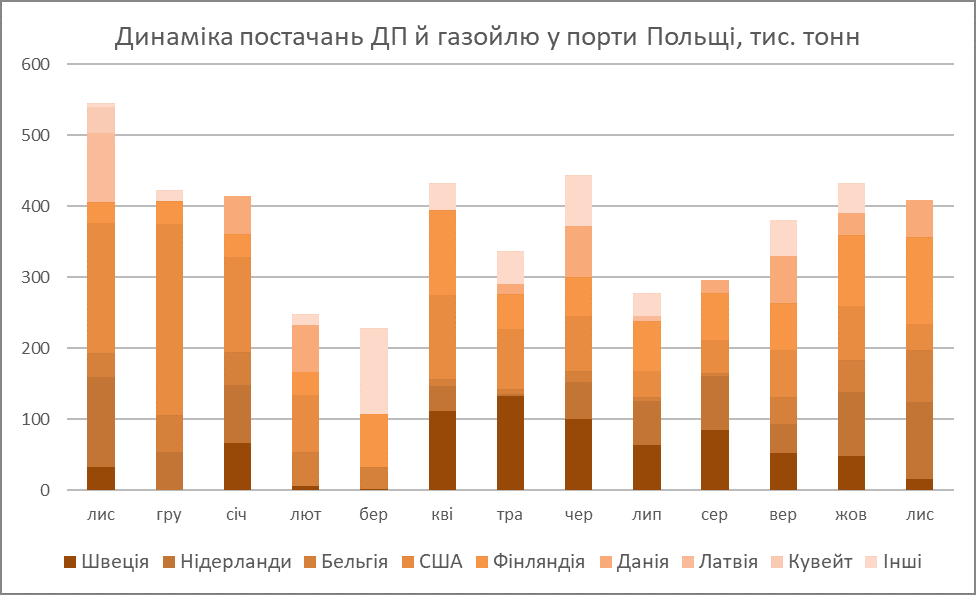 Морський імпорт дизелю з Данії у листопаді зріс на 69%, до 51 тис. т, тоді як інша скандинавська країна, Швеція, зменшила обсяги постачань у Польщу втричі, до 16 тис. т.