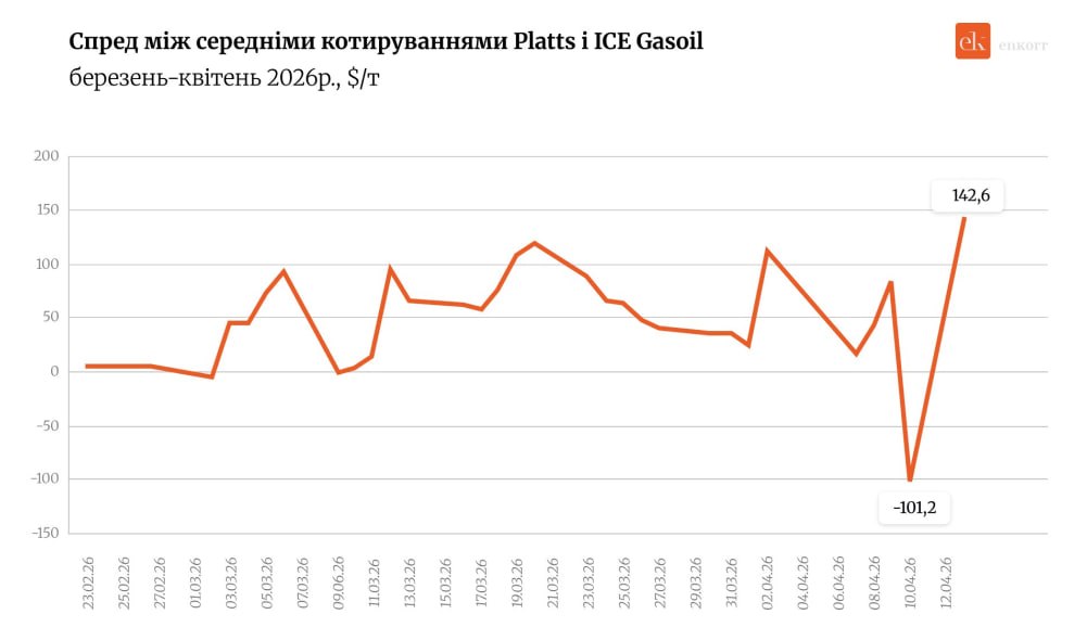 На початку тижня, 13 квітня, фізичний ринок дизельного пального і «паперовий» змінювалися різноспрямовано, що збільшило розрив між ними до максимуму з початку ескалації на Близькому Сході — $143/т. Так, спотові котирування в Європі в середньому за день зросли на $59/т, до $1360/т, тоді як ICE Gasoil знизився майже на $185/т, до $1218/т.