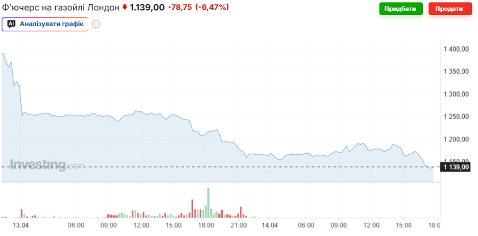 Незважаючи на стрибки нафти на початку тижня, ф’ючерси на газойль на Лондонській біржі зберігають низхідний тренд вже другу сесію. Згідно з даними Investing.com, 14 квітня станом на 17:50 ICE Gasoil торгується в межах $1139/т, що майже на $79 нижче рівня минулої торговельної сесії і на $263/т — за рівень кінця минулого тижня.
