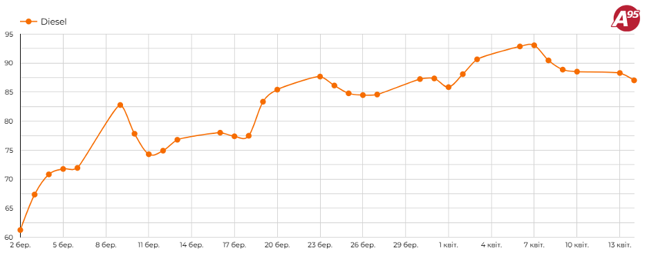 Станом на 14 квітня 1,60 грн/л додали до ціни в UKRNAFTA (89,50 грн/л). Це вже друге здорожчання пального в мережі з кінця минулого тижня. З того часу оператор додав 2,60 грн/л і втратив статус оператора з найнижчими цінами на дизель.