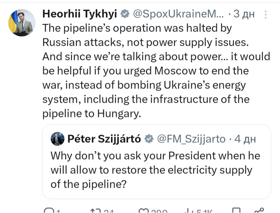 Останній звинуватив Україну у саботажі, мовляв, нічого не заважає продовжувати прокачування. На що Георгій Тихий, речник Міністерства закордонних справ України, порадив угорським колегам закликати москву припинити війну, замість того, щоб бомбардувати енергетичну систему України, включаючи інфраструктуру трубопроводу до Угорщини.