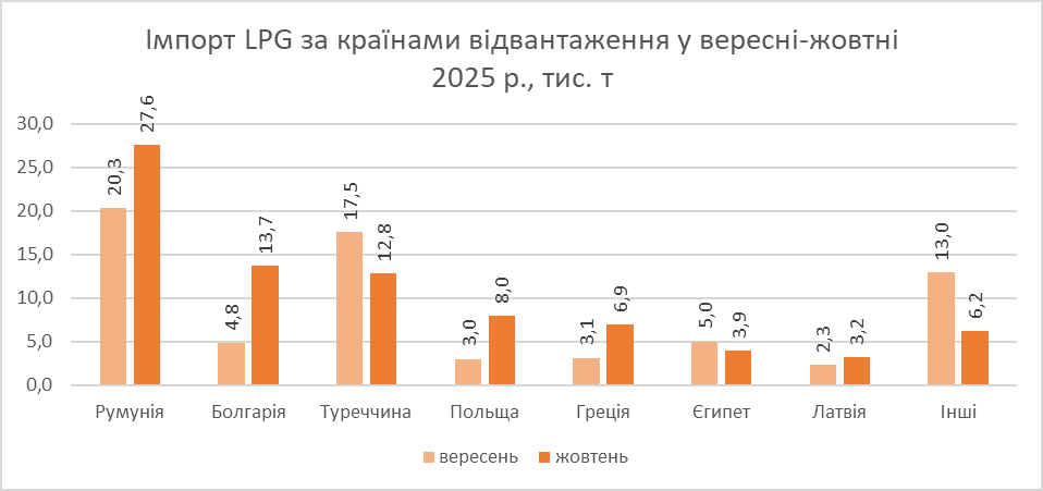 Загалом першість у постачанні зберігає Румунія: 27,6 тис. т (+36%). Найбільші обсяги заїхали від Vixon Gas для «Вігазтрейду», де компанія купувала пропан (6,1 тис. т, +50%). Бутан везла Rompetrol Rafinare (2,1 тис. т, -32%).