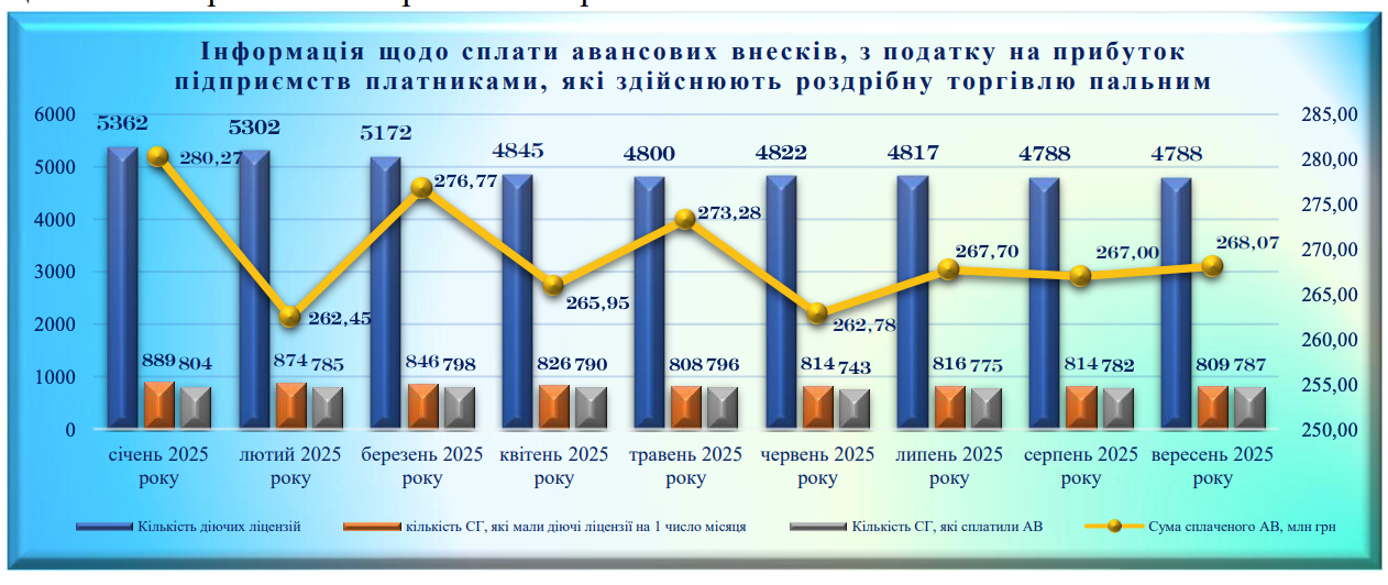 Ще один індикатор податкової дисципліни — авансовий внесок з податку на прибуток. У січні-вересні 2025 року платники, що здійснюють роздрібну торгівлю пальним, сплатили 2,4243 млрд грн авансів, із них 268 млн грн — у вересні.
