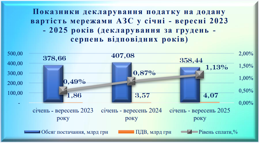 Водночас, за даними декларацій з ПДВ (по грудень 2024-го, січень-серпень 2025 року), обсяг постачання пального через мережі АЗС скоротився до 358,4 млрд грн, що на 48,6 млрд грн, або 12% менше, ніж за аналогічний період 2024 року.
