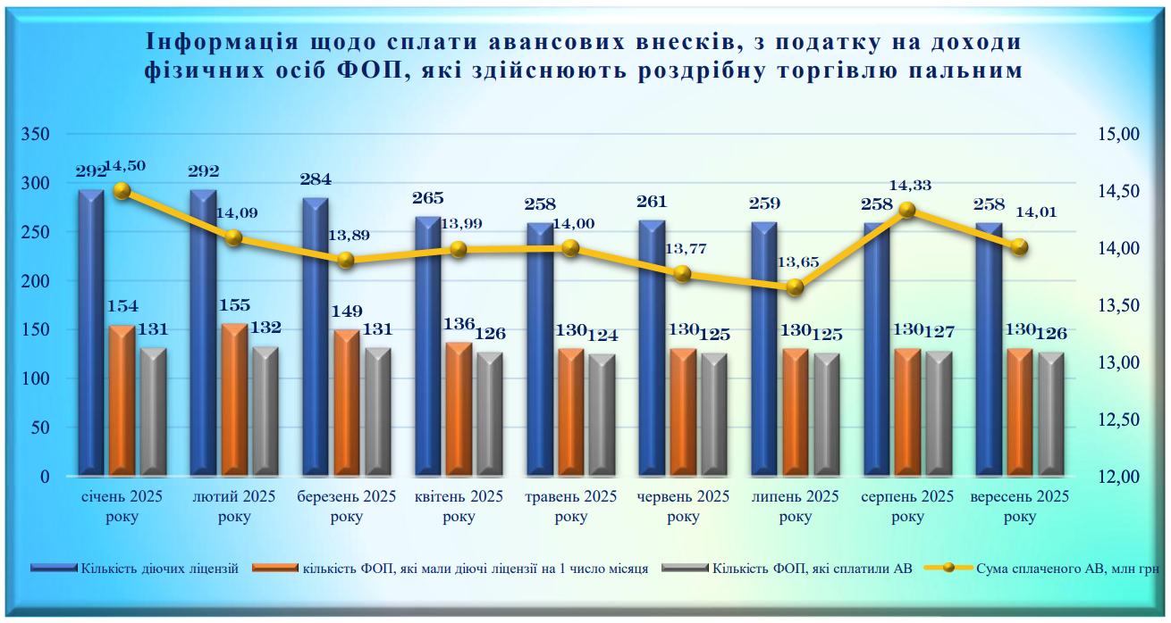 Так, за несплату авансових внесків протягом 9 місяців 2025 року анульовано 551 ліцензію у 368 суб’єктів господарювання, зокрема 26 ліцензій у вересні (5 у ФОПів і 21 — у юридичних осіб).