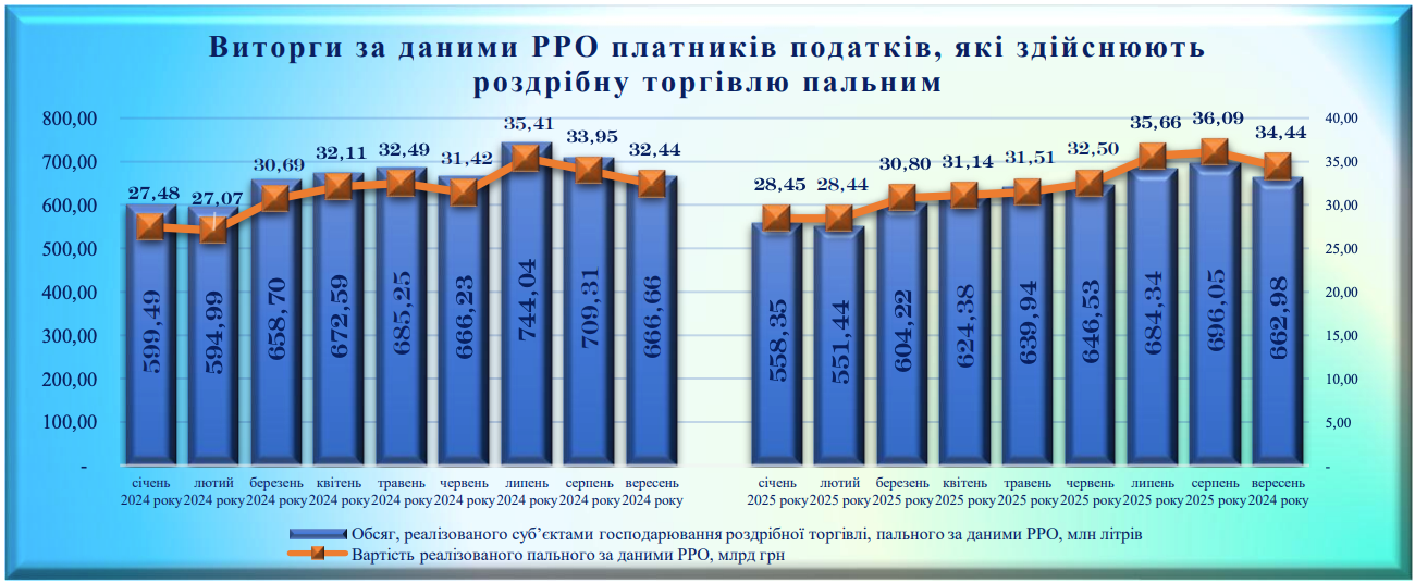 У вересні 2025 року податкова фіксує перший за тривалий час відкат: обсяги реалізації через РРО зменшилися щодо серпня на 33,1 млн л, а сума виторгу впала ще відчутніше — на 1,6 млрд грн.