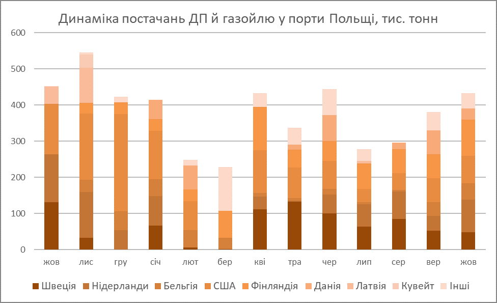 За 10 місяців у польські порти надійшло 3,5 млн т дизпального й газойлю, це на 23% менше порівняно з аналогічним періодом минулого року. Найбільші обсяги у січні-серпні цього року надходили з США (720 тис. т), Швеції (667 тис. т) й Фінляндії (665 тис. т).
