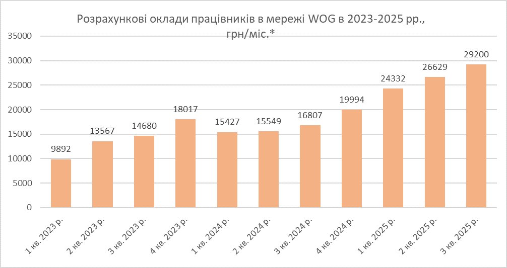 Мережа WOG упевнено нарощує «податкові» показники з 2024 року після серії публікацій про податкову дисципліну роздрібних мереж 2023 року. Так, у I кварталі 2023-го середній офіційний оклад у WOG становив 9 892 грн, тоді як у ІІІ кварталі 2025 року зріс до 29 200 грн на місяць. За результатами 9 місяців минулого року мережа посіла третє місце у «зарплатному» рейтингу ТОП-10 операторів роздрібного ринку, поступившись лише UPG й ОККО.