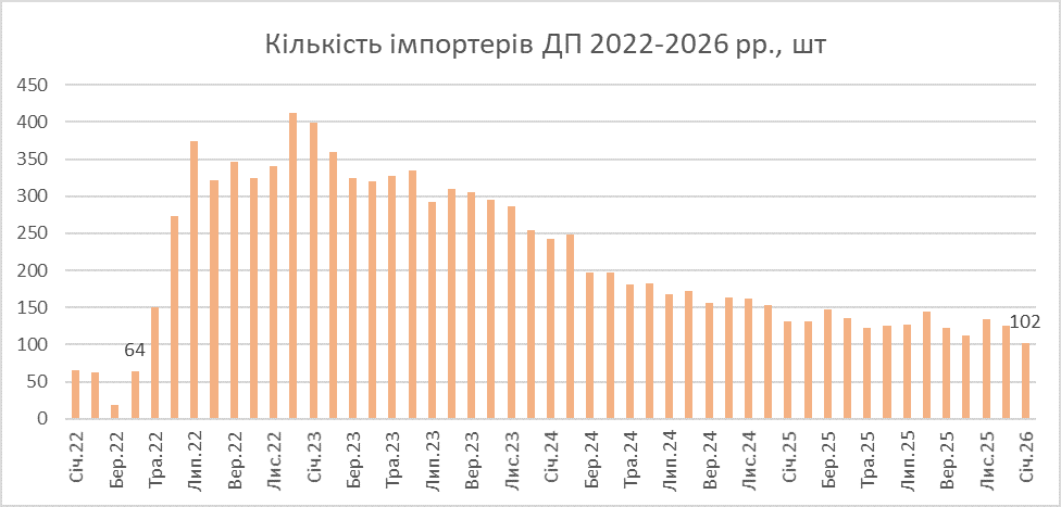 У підсумку морози «відфільтрували» 24 компанії: зі 126 у грудні в січні лишилося 102 імпортери, що є найменшим показником з травня 2022 року. Сумарно вони привезли 455,6 тис. т пального, що на 43% менше, ніж у грудні. Разом з тим це на 44% більше порівняно з січнем 2025-го.
